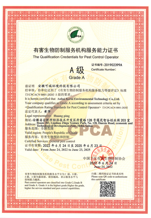 凱瑞蟲控擁有質量管理體系認證、環境管理體系認證、國家有害生物資質等各項證書